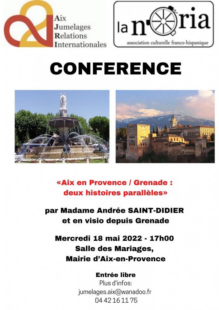 Dans le cadre du jumelage entre Aix et Grenade et à l’occasion du mois de l’Europe à Aix-en-Provence, l’Association des Jumelages et des Relations Internationales d’Aix-en-Provence, en partenariat avec nos amis de l’Association la Noria vous convient à une: