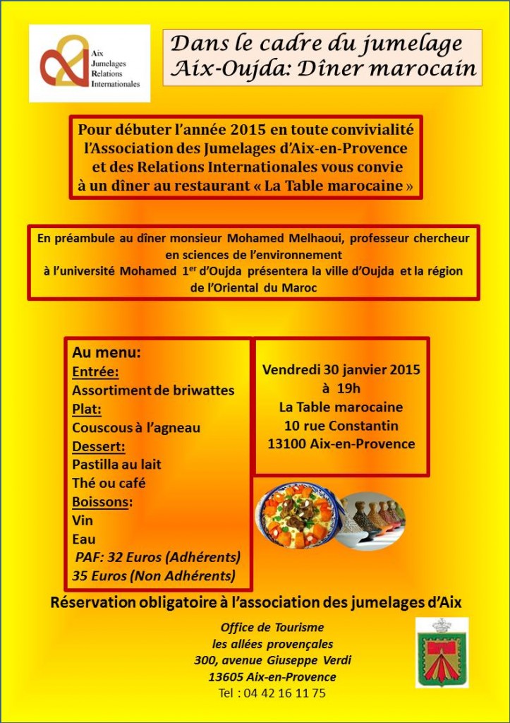 Afin de débuter l’année en toute convivialité l’Association des Jumelages et des relations Internationales d’Aix-en-Provence et plus particulièrement le jumelage Aix-Oujda vous convient à partager un dîner au restaurant « la Table marocaine » à Aix ,10 rue Constantin, 13100 Aix-en-Provence.