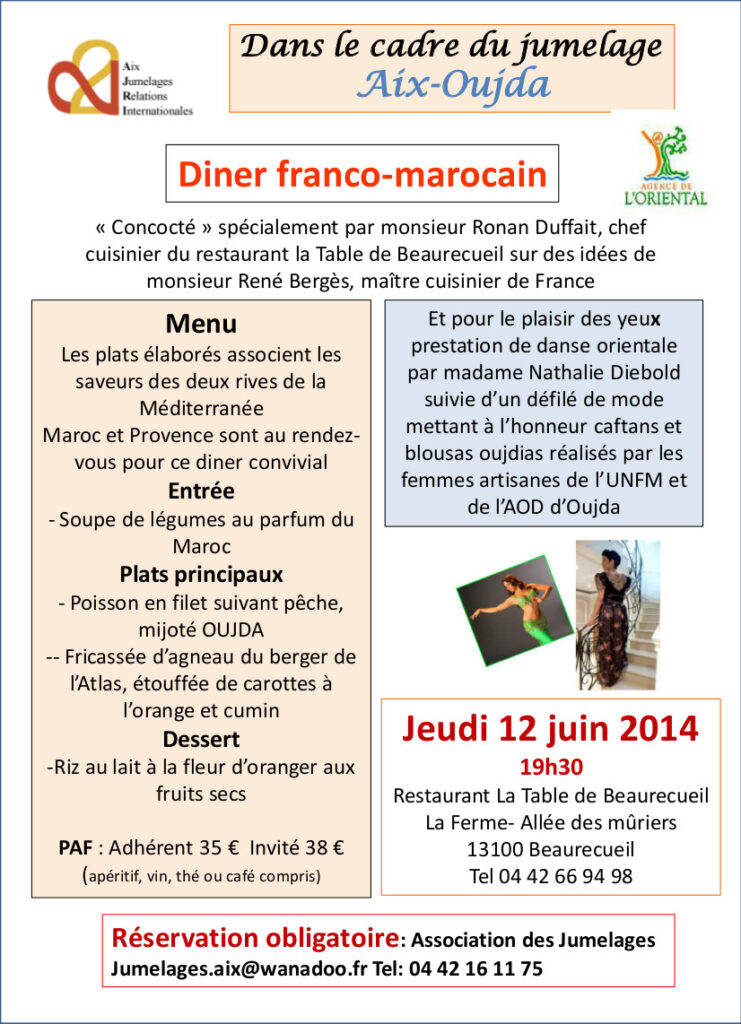 Centré sur un dîner franco-marocain concocté spécialement par monsieur Ronan Duffait, chef cuisinier du restaurant « La table de Beaurecueil » sur des idées de monsieur René Bergès, maître cuisiner, cette soirée mettra à l’honneur notre jumelle marocaine, OUJDA à 19h30.