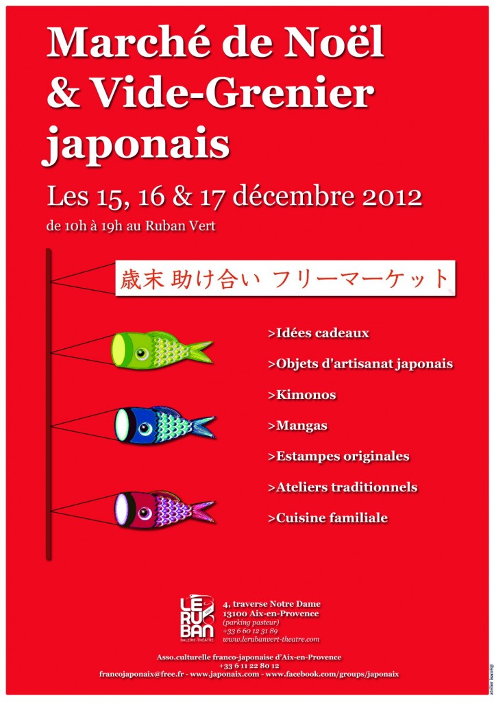 Un marché de noël et vide-grenier 100% nippon sera organisé au théâtre Ruban Vert du 15 au 17 décembre. On y trouvera artisanat, BD mangas, kimonos, estampes originales, ateliers traditionnels et produits de la cuisine familiale.