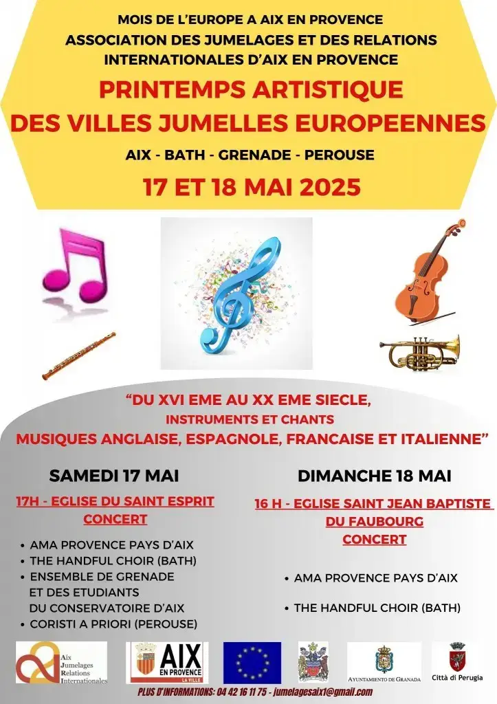 Dans le cadre des Journées de l’Europe 2025 à Aix-en-Provence, l’Association des Jumelages et des Relations Internationales d’Aix-en-Provence organise la neuvième édition du PRINTEMPS ARTISTIQUE DES VILLES JUMELLES EUROPÉENNES, les 17 et 18 mai 2025.