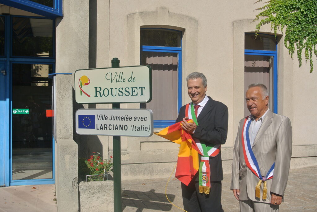 Samedi 31 août, une délégation composée de notre président, de Marie Thérèse Udovitch, Jean Luc Mayence et Jean Sintilla s’est rendue à Rousset pour répondre à l’aimable invitation du maire de Rousset, à la cérémonie et à la signature du jumelage entre Rousset, commune du Pays d’Aix et Larciano en Italie. Un accueil amical et chaleureux nous a été réservé.